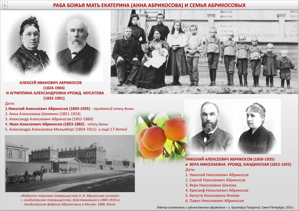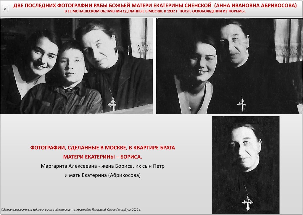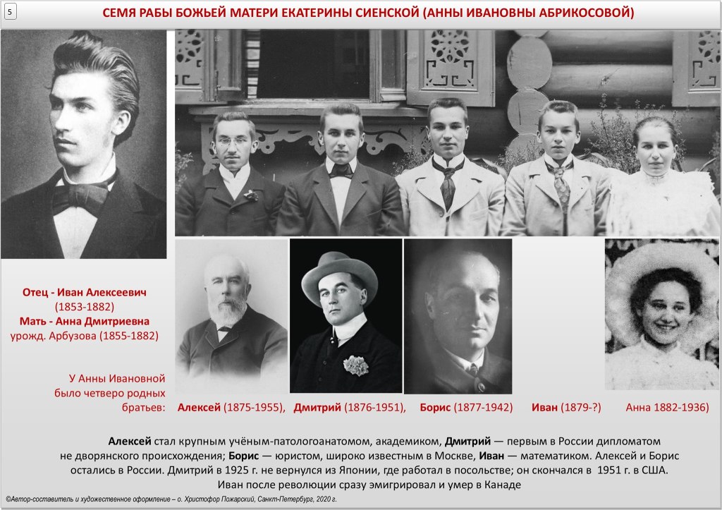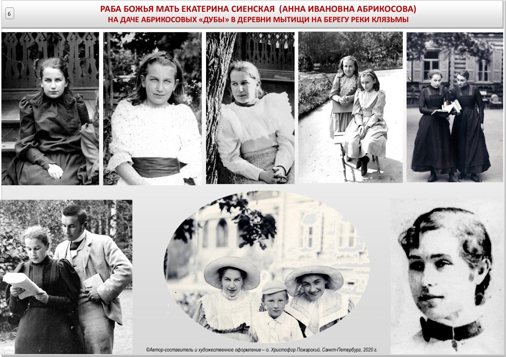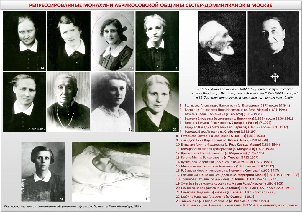Anna Abrikosowa, c. Iwana urodziła się 23 stycznia 1882 roku w Moskwie w rodzinie kupieckiej, która z chłopów pańszczyźnianych dorobiła się wielkiego majątku. W 1903 r ukończyła Garton college uniwersytetu Cambridge, wróciła do Rosji i wyszła za mąż za Władimira Abrikosowa. 20 grudnia 1908 roku w Paryżu przyjęła katolicyzm. W 1913 roku została przyjęta do Trzeciego Zakonu św. Dominika. W 1917 r przeszła na bizantyjski obrządek. W 1917 roku założyła i stanęła na czele zgromadzenia sióstr tercjarek Zakonu św. Dominika. W 1923 roku była aresztowana wraz z siostrami swojej wspólnoty, a następnie skazana na 10 lat więzienia. W 1932 roku przeszła operację raka piersi i ze względu na stan zdrowia została uwolniona. W 1933 roku została znów aresztowana i skazana na 8 lat łagrów. Zmarła 23 lipca 1936 roku w szpitalu Butyrskiego więzienia w Moskwie, ciało poddano kremacji 27 lipca 1936 roku.***Modlitwa o beatyfikację Sługi Bożej matki Marii Katarzyny Sieneńskiej Wszechmogący Boże, Twój Syn cierpiał i umarł na krzyżu dla zbawienia ludzi. Naśladując Go, służebnica Twoja matka Katarzyna Abrykosowa umiłowała Cię z całego serca, wiernie Tobie służył w czasie prześladowań i poświęciła swoje życie za Kościół. Wsław ją w gronie Twoich błogosławionych, aby przykład jej wierności i miłości zajaśniał wobec całego świata. Błagam Cię, przez jej wstawiennictwo, wysłuchaj moją prośbę… Przez Chrystusa Pana naszego. Amen.Modlitwa może być wykorzystywana do odmawiania zarówno prywatnie, jak i publicznie poza Mszą św. +Arcybiskup Tadeusz Kondrusiewicz, Petersburg. 05.04.2004O łaskach, otrzymanych przez wstawiennictwo Służebnicy Bożej, należy powiadomić postulatora procesu pod adresem: ks. Krzysztof Pożarski, 190121, Sankt Petersburg, Rosja, ul. Sojuza Pieczatnikow 22 ,e-mail: postulator-rus@mail.ru