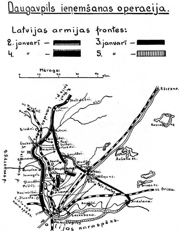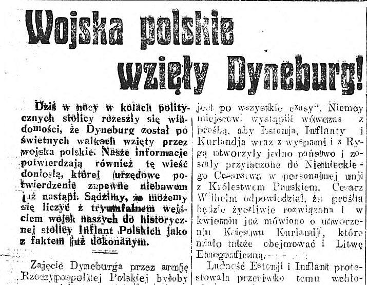 W styczniu i lutym 1920 roku Wojsko Polskie (1 i 3 Dywizja Piechoty Legionów) – około 30 tysięcy żołnierzy polskich, a także 2 kompania czołgów z 1 pułku czołgów – około 25 czołgów) pomogło Łotyszom wyzwolić się spod bolszewickiego panowania. W wyniku porozumienia gen. Edward Rydz-Śmigły objął naczelne dowództwo nad sprzymierzonymi wojskami. Dlatego też w dniu 3 stycznia 1920 r. polsko-łotewskie oddziały stanęły do walki z agresorem. Rozpoczęły się bojowe działania o kryptonimie „Zima”, znaną także pod nazwą Kampania Łatgalska. I już w pierwszym dniu działań Polacy zdołały wyzwolić Dyneburg (Dźwińsk albo Daugavpilis). Właściwie to Polacy na francuskich czołgach wyzwolili miasto, gdyż gdy je bolszewicy zobaczyli w działaniu – spanikowali i zaczęli uciekać. Wieczorem zaś do miasta wkroczyły oddziały łotewskie. W dniu 9 stycznia 1920 roku oddziały łotewskie wspomagane oddziałami polskimi rozpoczęły ofensywę w Łatgalii Północnej, co za dwa miesiące doprowadziło do wyzwolenia całych dawnych Inflant Polskich. Pozwoliło to na zachowanie niepodległości państwa łotewskiego oraz jego zjednoczenie. Wojsko Polskie za wojenną pomoc zapłaciło dosyć dużo żołnierskich ofiar. Zginęło ponad 500 polskich żołnierzy, z czego 237 zostało pochowanych na cmentarzu na Słobódce w Dyneburgu, W miejscu, gdzie obecnie wznosi się betonowy krzyż na miejskim cmentarzu, kiedyś były także groby polskich zołnierzy. Sama żołnierska nekropolia była uroczyście otwarta w 1926 roku. Niedaleko w Krasławiu spoczywa kolejnych 87 polskich żołnierzy zmarłych w wyniku chorób, ran i odmrożeń, służyli głównie w pułkach 3 Dywizji Piechoty. Pozostałych żołnierzy groby do dziś rozsiane są po wschodniej Łotwie. Walki żołnierzy polskich o Dyneburg zostały upamiętnione na Grobie Nieznanego Żołnierza w Warszawie, napisem na jednej z tablic w II RP i po 1990 – „DYNEBURG 3 I 1920”.