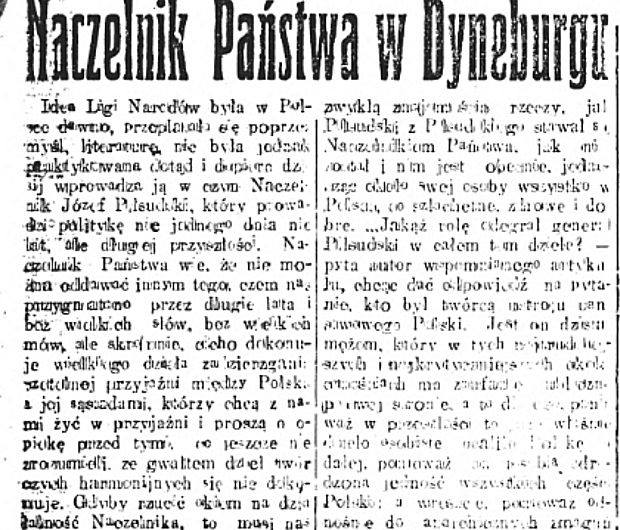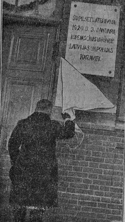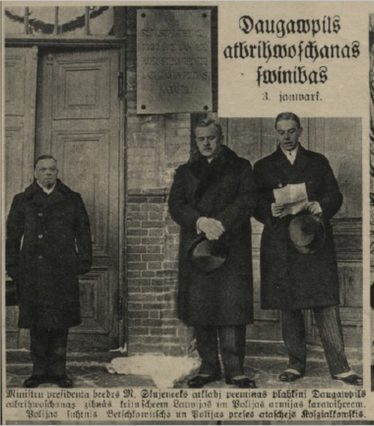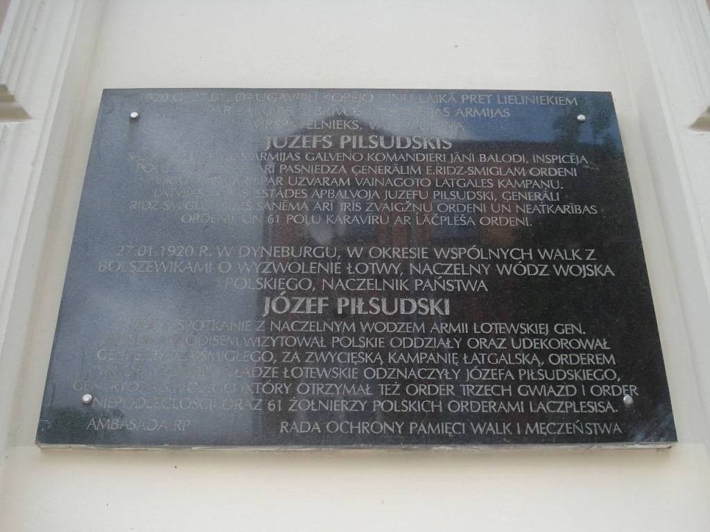 Zaczniemy od bardzo skromnej tablicy pamiątkowej tylko w języku łotewskim na budynku samorządu miejskiego w Dyneburgu (Daugavpilis). Tablica głosiła „SO PILSETU ATBRIVDJA 1920. G3. JANVARI KOPEJAS CINAS VARONIGIE LATVIJAS UN POLIJAS KARAVIRI”. Co oznaczało „Miasto to zostało wyzwolone 3 stycznia 1920 roku, kiedy to bohaterscy żołnierze łotewscy i polscy walczyli razem” (tłum). Tablica ta została odsłonięta na budynku merostwa w 15. Rocznicę wyzwolenia miasta, tj. 3 stycznia 1935 roku. W tej uroczystości uczestniczyli też generałowie i oficerowie Wojska Polskiego. Zdjęcia z tej uroczystości można zobaczyć na przedstawionych zdjęciach niżej. Tablica ta upamiętniająca polsko-łotewskie braterstwo broni w czasach sowieckich została zniszczona. Dopiero w dniu 3 stycznia 2020 roku, tj. na 100. Lecie wyzwolenia Dyneburga kopia tejże tablicy znowuż zawisła na budynku merostwa.W uroczystościach wzięli udział m.in. Szef Sztabu Generalnego Wojska Polskiego generał Rajmund T. Andrzejczak, Dowódca Narodowych Sił Zbrojnych Republiki Łotewskiej gen. broni Leonids Kalnins, Ambasador RP w Rydze dr Monika Michaliszyn, wicepremier parlamentu Łotewskiego Janis Bordans. Po tej uroczystości została odprawiona Msza Św. przez biskupa polowego gen. Józefa Guzdka, po której przemawiali Szef Sztabu Generalnego Wojska Polskiego, gen. Rajmund Andrzejczak i dowódca Narodowych Sił Zbrojnych Republiki Łotewskiej gen. Leonīds Kalniņš.