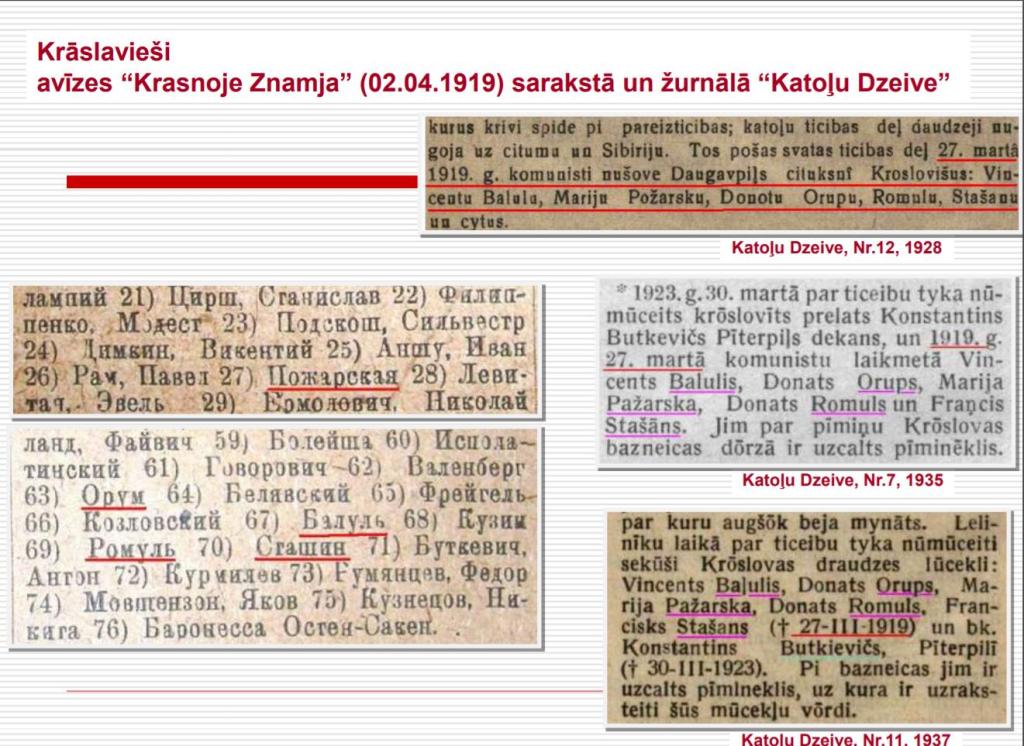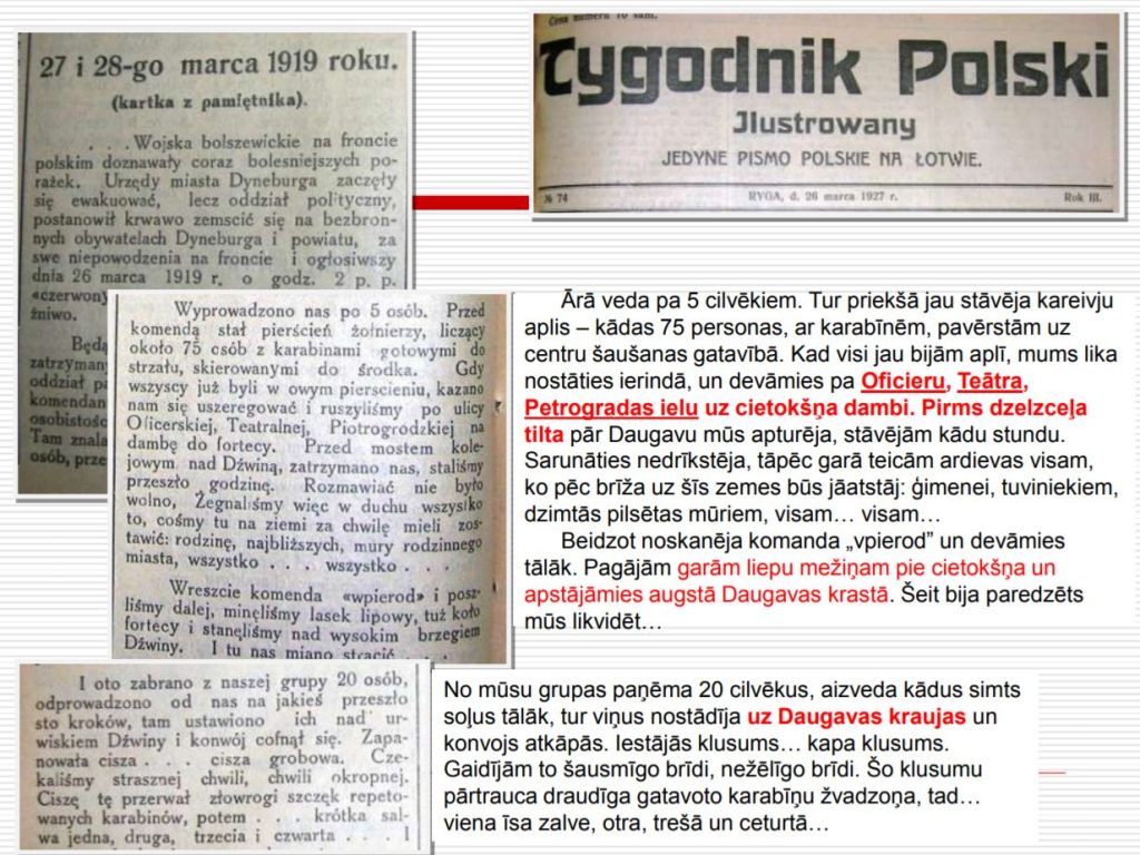 BOLSZEWICY W 1919 ROKU W DYNEBURGU (DŹWIŃSKU) ZAMORDOWALI MOJĄ KREWNĄ – MARIĘ POŻARSKĄ Z KRASŁAWIA. Część 4 W nocy z 27 na 28 marca 1919 r. bolszewicy przeprowadzili w Dzwińsku (Dyneburgu) najbardziej masową egzekucję. Zostali o tym powiadomieni mieszkańcy miasta w gazecie «Krasnoje Znamia”. W artykule poinformowano, że Komisja ds. Utrzymania Porządku w Okręgu Dźwińskim w dniu 30 marca 1919 r . podjęła decyzję o rozstrzelaniu grupy ludzi. Informowano, że w Dźwińsku wykryto organizację „Biała Gwardia”, której celem było zdyskredytowanie i obalenie istniejącej władzy sowieckiej przez zbrojne powstanie. Komisja ds. Utrzymania Porządku, po zbadaniu sprawy, postanowiła rozstrzelać wszystkich członków tej organizacji, co odbyło się w dniu z 27 na 28 marca 1919 r., o godz. 4 rano. Jednocześnie też w gazecie podano listę dywersantów już rozstrzelanych (razem 76 osób), a także dodatkowo zamordowano „za chuligaństwo, rabunek i morderstwo” – 22 osoby. Mordu dokonano w twierdzy dynaburskiej.Rozstrzelano wtedy m.in.1. Baļulis, Vincents 2. Begams Daniils 3. Beļajevs Jakovs 4. Beļavskis Vladimirs 5. Boleišo, Antons 6. Boleišo, Helēna (*1881)7. Butkevičs Antons (*1864)8. Filipjonoks, arī Vešters, Modests9. Gencs Nikolajs10. Glinskis Izidors11. Gofmans Romualds 12. Gorkins Stepans 13. Govorovičs Mihails (*1856)14. Ispolatinskis Orests 15. Jermolajevs Mihails (*1881)16. Jermolovičs Nikolajs 17. Kalita Ivans (187418. Kurmeļovs Timofejs (*1869)19. Kuzņecovs, Ņikita 20. Levitāns Evels21. Mihailovs Lazars 22. Movšensons Jakovs (*1860)23. Ņikitins Vasilijs (*1847)24. Orups, Donots 25. Osten Zakena 26. Peļehovs Mihails27. Popovs Anatolijs28. POŽARSKA MARIJA 29. Romuls, Donāts30. Rumjancevs Fjodors (*1847)31. Stašāns, Francisks 32. Tolstovs Afanasijs (*1859)33. Vasjukovs Aleksejs (*1879)34. Zinkels, Eižens (*1880)Trudno powiedzieć ilu wśród nich było Polaków, gdyż zapewne nikt tego nie badał. Z samego Krasławia rozstrzelano razem – 5 osób, w tym moja krewną Marię Pożarską. Niestety, po dzień dzisiejszy w Dyneburgu nie ma o tej zbrodni żadnego upamiętnienia! Chyba, że się mylę. Łotysze w przeciwieństwie do Polaków, nie dbają o takie sprawy!