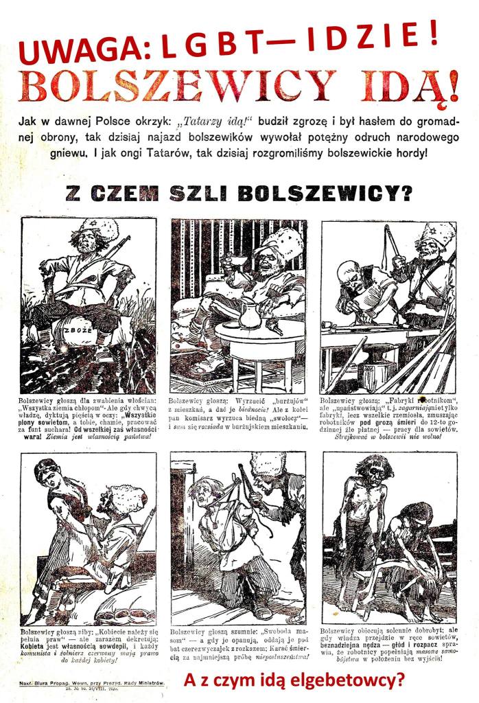 Z PRZEDWOJENNEGO POLSKIEGO HUMORU (Warszawa 1920) Czy to nie jest w czymś podobne? Z czym szli bolszewicy!Jak w dawnej Polsce okrzyk „Tatarzy idą”, a później „bolszewicy idą” budził zgrozę i był hasłem do wspólnej obrony, tak dzisiaj najazd LGBT powinien wywołać odruch narodowego sprzeciwu. Tak, jak kiedyś nasi przodkowie powstrzymali Tatarów i bolszewików, tak dzisiaj powstrzymajmy w Polsce i w Europie elgebetowców, to jest neobolszewików, którzy dążą do rozruszania tradycyjnych wartości i wiary w Boga. UWAGA: LGBT – IDZIE. PODAJ DALEJ!