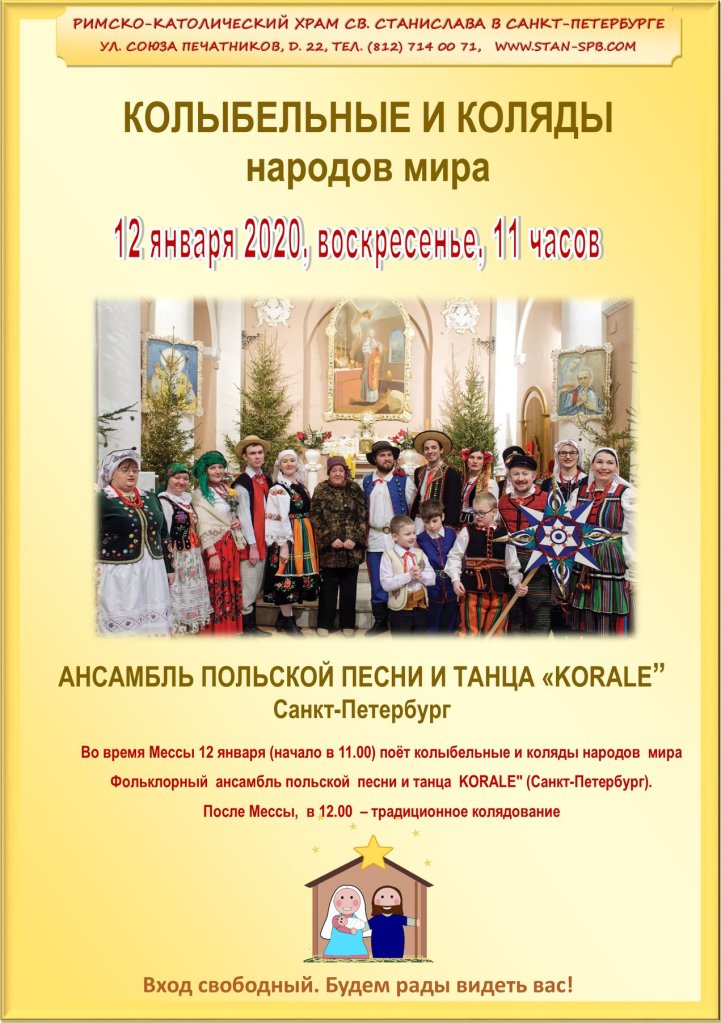 KOŚCIÓŁ ŚW. STANISŁAWA W SANKT PETERSBURGU 12 stycznia 2020 roku (godz. 11.00) w kościele św. Stanisława w Petersburgu KOLĘDY I KOŁYSANKI NARODÓW ŚWIATA w wykonaniu Zespółu Folklorystycznego Polskiej Pieśni i Tańca „Korale” z Sankt Petersburga. Zespół śpiewa podczas Mszy św. (początek o godz. 11.00) kolędy narodów świata. Po Mszy, o godz. 12.00 ich tradycyjne kolędowanie w kościele.SERDECZNIE ZAPRASZAMY!