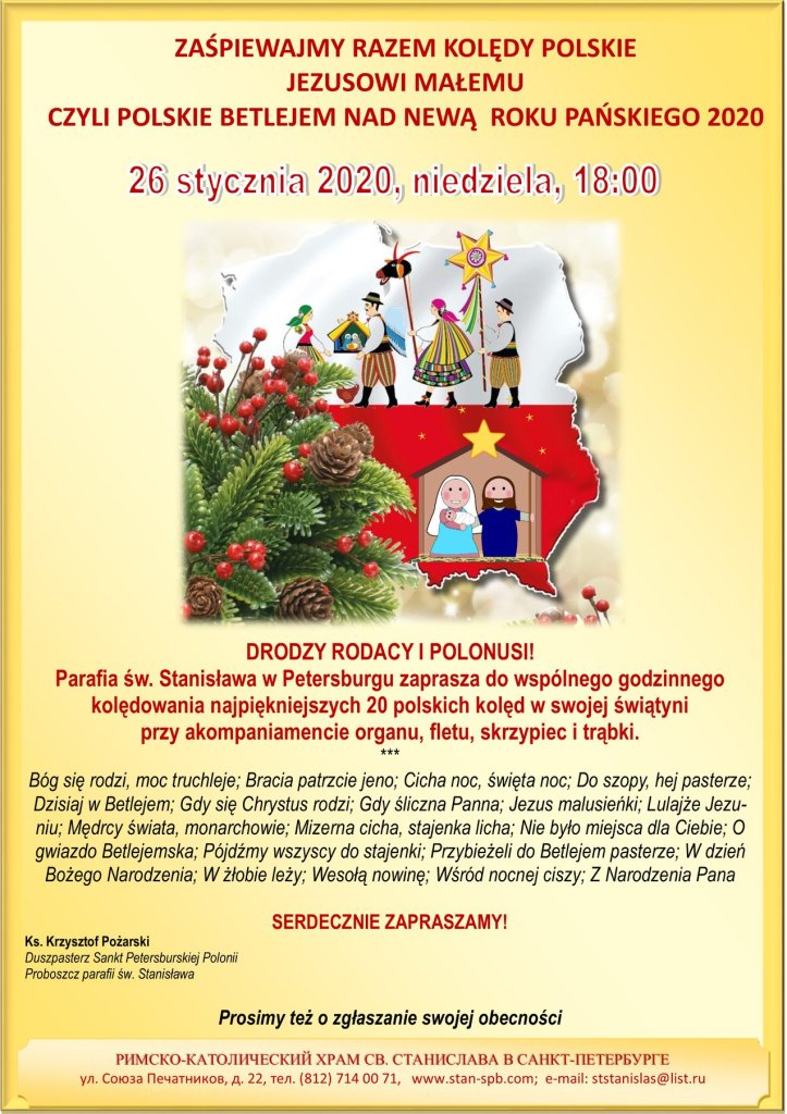 26 stycznia 2020 roku (niedziela) 18:00ZAŚPIEWAJMY RAZEM KOLĘDY POLSKIE JEZUSOWI MAŁEMU CZYLI POLSKIE BETLEJEM NAD NEWĄ ROKU PAŃSKIEGO 2020DRODZY RODACY I POLONUSI,Parafia św. Stanisława w Petersburgu zaprasza do wspólnego godzinnego kolędowania najpiękniejszych polskich kolęd w swojej świątyni przy akompaniamencie organu, fletu, skrzypiec i trąbki.Bóg się rodzi, moc truchleje; Bracia patrzcie jeno; Cicha noc, święta noc; Do szopy, hej pasterze; Dzisiaj w Betlejem; Gdy się Chrystus rodzi; Gdy śliczna Panna; Jezus malusieńki; Lulajże Jezuniu; Mędrcy świata, monarchowie; Mizerna cicha, stajenka licha; Nie było miejsca dla Ciebie; O gwiazdo Betlejemska; Pójdźmy wszyscy do stajenki; Przybieżeli do Betlejem pasterze; W dzień Bożego Narodzenia; W żłobie leży; Wesołą nowinę; Wśród nocnej ciszy; Z Narodzenia Pana SERDECZNIE ZAPRASZAMY!Ks. Krzysztof PożarskiDuszpasterz Sankt Petersburskiej PoloniiProboszcz parafii św. Stanisława