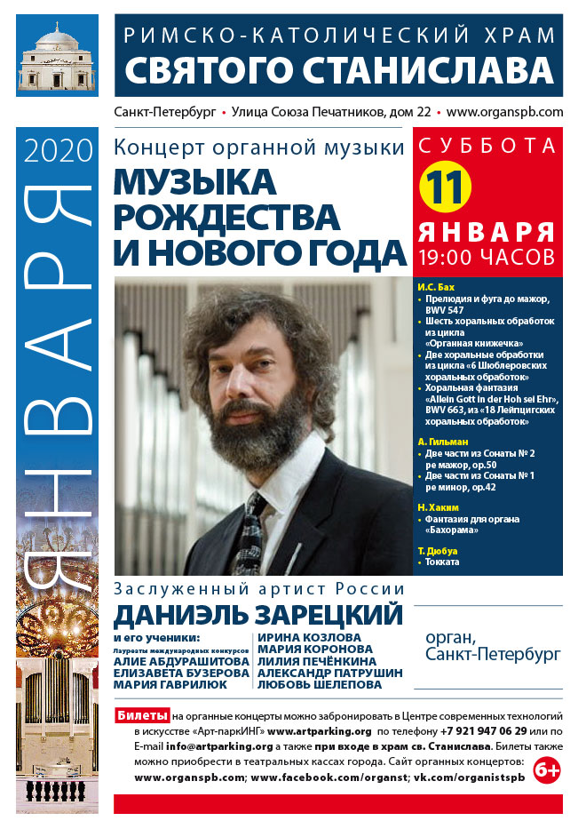 11.01.2020 – KOŚCIÓŁ ŚW. STANISŁAWA W PETERSBURGUOd wielu już lat parafia św. Stanisława współpracuje z różnymi wykładowcami organnych katedr w Petersburgu i daje możliwość grania studentom na organach w swoim kościele. W ten sposób mogą doskonalić swoją umiejętność i zdobywać odpowiednie doświadczenie. Katedry organowe są w Petersburskim Konserwatorium, jak i na Państwowym Petersburskim Uniwersytecie. Organmistrzowskiej sztuki uczy się w Północnej Stolicy Rosji jednocześnie kilkadziesiąt studentów z całej Rosji. Grając na organach w świątyni studenci także zapoznają się z katolickimi tradycjami, co powinno owocować w ich późniejszej pracy zawodowej. Czyż można więcej zrobić dla poprawy stosunków polsko- rosyjskich, jak robi to parafia św. Stanisława od wielu lat? Jednak mało osób to widzi, a może to i dobrze!Dzisiaj w kościele św. Stanisława odbył się organowy koncert ośmiu studentów, laureatów międzynarodowych konkursów z klasy prof. Daniela Zareckiego, zasłużonego artysty Rosji. Tytuł koncertu brzmiał „Muzyka Bożonarodzeniowa I Nowego Roku”. Od 2007 r. prof. Zarecki jest profesorem nadzwyczajnym działu organów i klawesynów Konserwatorium w Petersburgu, od 2011 r. jest kierownikiem katedry organów i klawesynu. Wielu studentów prof. Daniela Zareckiego jest laureatami międzynarodowych i krajowych konkursów. Daje on także koncerty w Polsce.