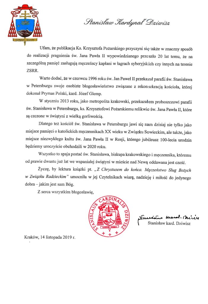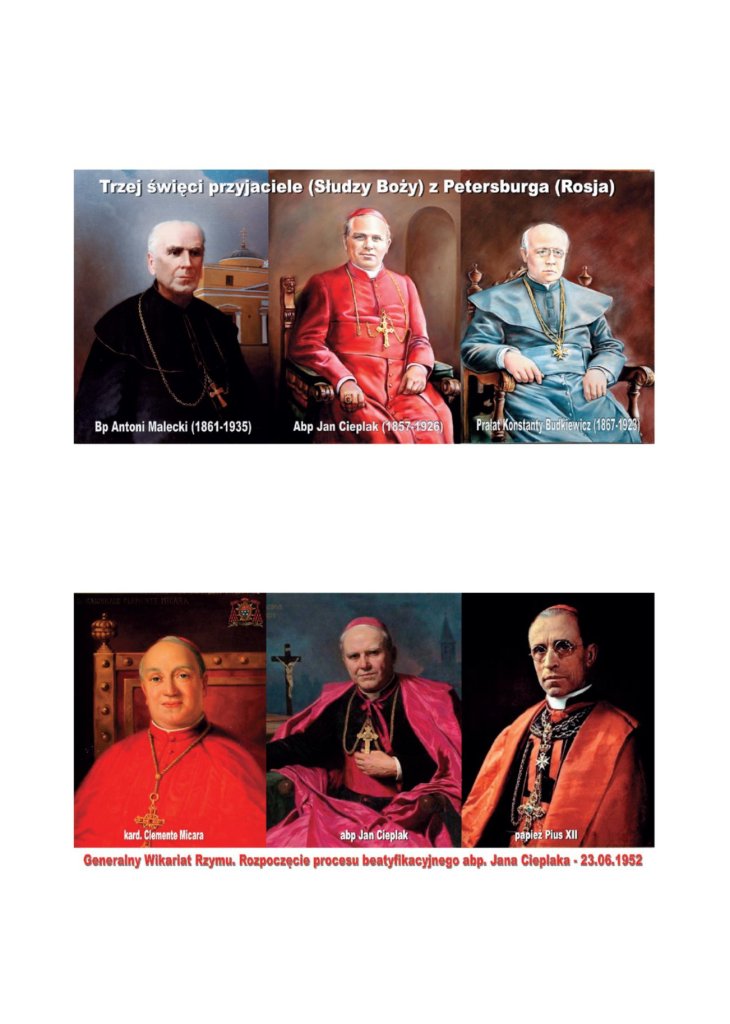 ZAPROSZENIEPrezentacja książki w Warszawie: „Z CHRYSTUSEM DO KOŃCA. MĘCZEŃSTWO SŁUG BOŻYCH W ZWIĄZKU SOWIECKIM” Na początku 2020 roku Wydawnictwo AA w Krakowie przy współpracy z postulatorem procesu beatyfikacji rosyjskich katolickich męczenników XX wieku w Petersburgu wydało pozycję „Z Chrystusem do końca. Męczeństwo Sług Bożych w Związku Sowieckim” (528 stron). Oficjalna prezentacja książki zawierającą biografię czternastu Sług Bożych odbędzie się w Sekretariacie Episkopatu Polski w Warszawie w dniu 11 marca (środa) 2020, godz. 12.00 (Skwer kard. Wyszyńskiego 6) Książka jest pracą zbiorową pod redakcją postulatora procesu w Rosji – ks. Krzysztofa Pożarskiego. Zostały zawarte w niej biogramy następujących Sług Bożych, z których większość stanowią Polacy: bp. Antoni Maleckiego (1861-1935), prałata Konstantyna Budkiewicza (1867-1923); księży: Franciszka Budrysa (1882-1937), Jana Trojgo (1881-1932), Pawła Chomicza (1893-1942), Antoniego Czerwińskiego (1881-1938), Epifaniusza (Igora) Akułowa (1897-1937), Potapija (Piotra) Emelianowa (1884-1936); sióstr zakonnych: m. Marii Katarzyny Sieneńskiej (Anny Abrikosowej), s. Róży Serca Maryi, OPL (Heleny Jętkiewicz (1896-1944), a także jednej osoby świeckiej – Kamili Kruszelnickiej (1892-1937). Poza tym w książce dodano obszerny życiorys Sługi Bożego abp. Jana Cieplaka (1857-1926), którego proces beatyfikacyjny rozpoczął się w Rzymie w 1952 roku. Obecnie Archidiecezja Matki Bożej w Moskwie pragnie go wznowić. Został załączony także życiorys ks. Antoniego Dziemieszkiewicza (1891-1937), a także biskupa władywostockiego – bp. Karola Śliwowskiego (1855-1933). Jest wielka nadzieja, że ich osoby zostaną także włączone do procesu beatyfikacyjnego przy kolejnej jego reorganizacji w Rosji. Książkę kończy obszerny artykuł ks. Bronisława Czaplickiego „Bolszewicki komunizm – prześladowca Kościoła Katolickiego w Rosji (ZSRR), czyli historia prześladowań Kościoła katolickiego w carskiej Rosji i w ZSRR. Kard. Stanisław Dziwisz napisał słowo wstępne, aby podkreślić ważność tej publikacji o katolickich męczennikach Rosji XX wieku w Polsce, gdyż takie było pragnienie św. Jana Pawła II. Rok 2020, to także Jubileusz 100-lecia urodzin św. Jana Pawła II, który uczył nas takimi słowami: „Na szczególną pamięć zasługuje martyrologium kapłanów w łagrach syberyjskich czy innych na terenie Związku Sowieckiego” („Dar i Tajemnica” s.38), a także „W naszym stuleciu wrócili męczennicy. A są to często męczennicy nieznani, jak gdyby „nieznani żołnierze” wielkiej sprawy Bożej. Jeśli jest to możliwe, ich świadectwa nie powinny być zapomniane w Kościele” („Tertio millennio adveniente”). Ta prezentacja książki o męczennikach na Wschodzie, to także wypełnienie pragnień Wielkiego Papieża i dobrze wpisuje się w jego Jubileusz w Polsce. Sylwetki Sług Bożych zaprezentowanych w książce, to także przyszli błogosławieni i święci narodu polskiego pracujących na Wschodzie, mimo, że ich proces beatyfikacyjny toczy się w Moskwie. Stanowili oni wspólnotę ducha polskiego, jego wartości i narodowego patriotyzmu.Prezentacja książki odbędzie się pod honorowym patronatem metropolity Archidiecezji Matki Bożej w Moskwie – abp. Pawła Pezzi (Rosja), a także metropolity Archidiecezji Mińsko-Mohylewskiej – abp. Tadeusza Kondrusiewicza (Białoruś). Patronat medialny nad naszą prezentacją objęła Katolicka Agencja Informacyjna. Wszystkich chętnych pragnących wziąć udział w prezentacji książki w Warszawie proszę pisać na adres e-mail: ststanislas@list.ru lub zadzwonić po tel. +7 911 990 90 82Z wyrazami szacunkuKs. Krzysztof Pożarski, postulator procesu beatyfikacji katolickich męczenników XX wieku w Rosji, Sankt Petersburg