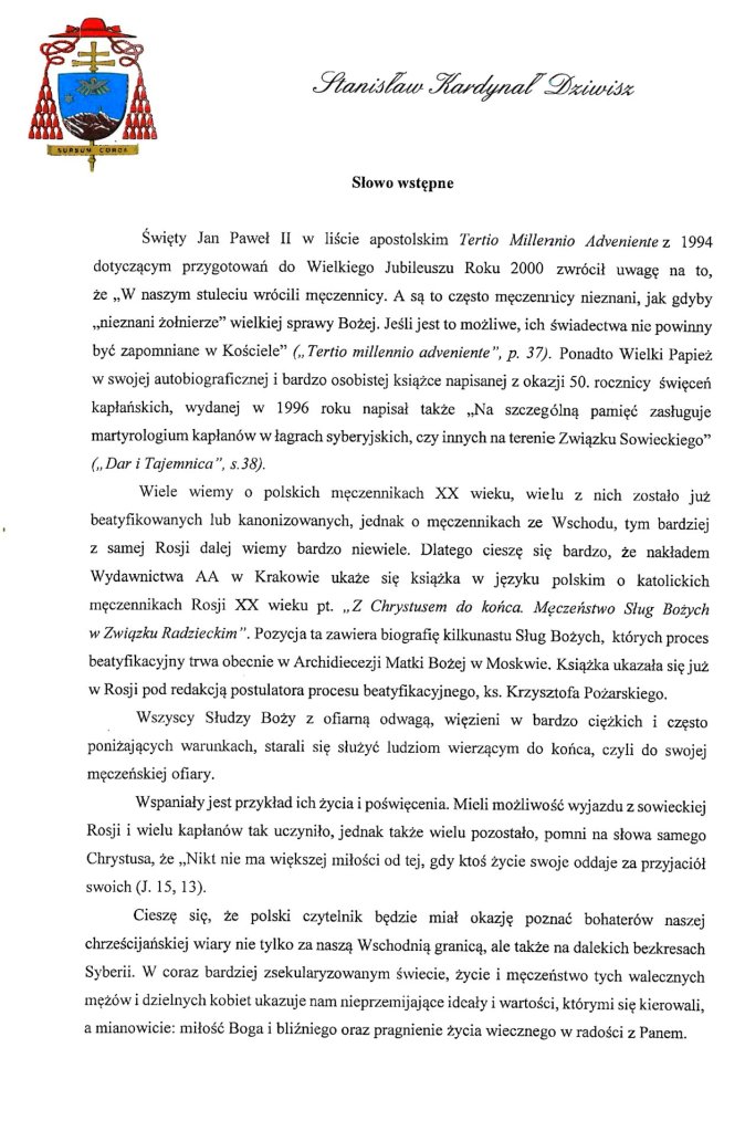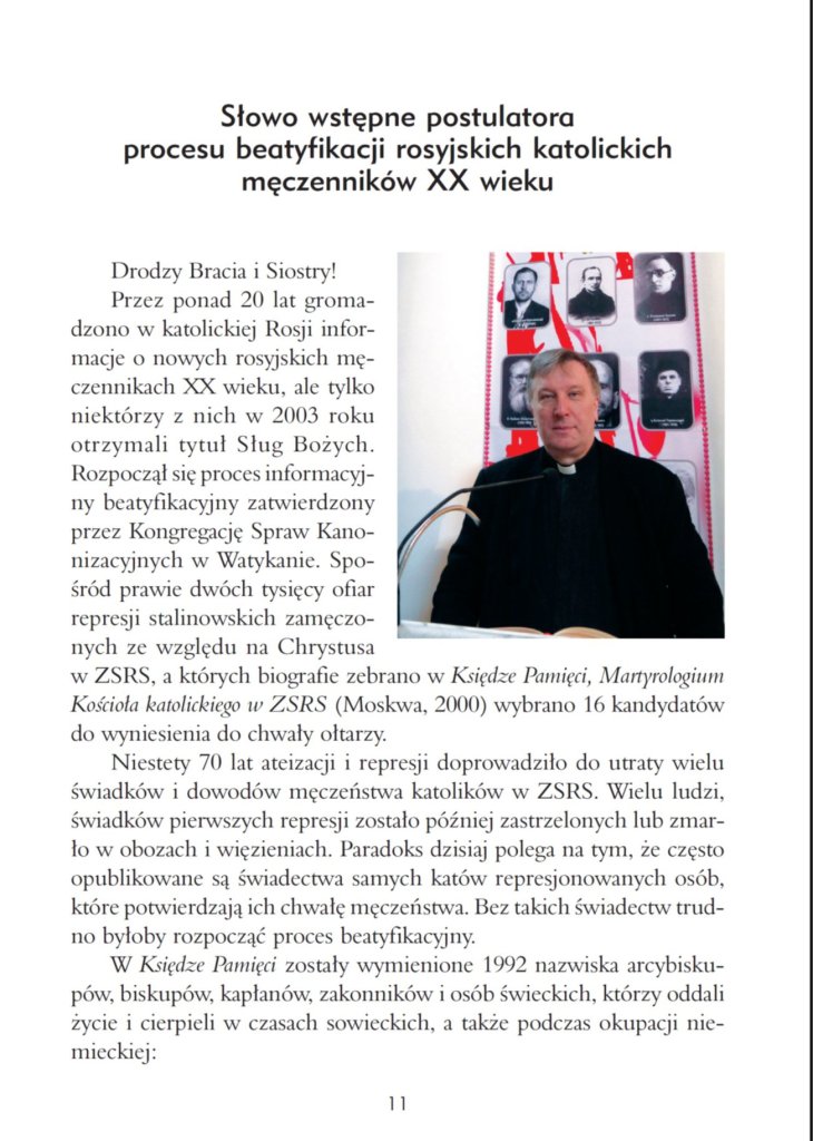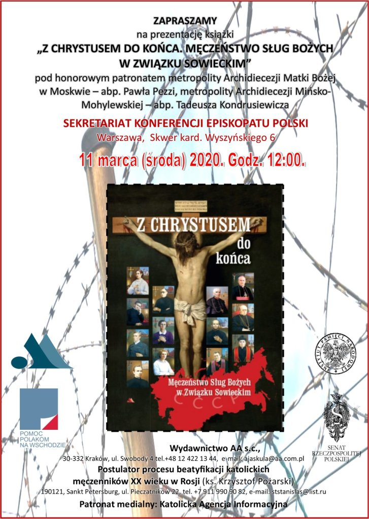 Na początku 2020 roku Wydawnictwo AA w Krakowie przy współpracy z postulatorem procesu beatyfikacji rosyjskich katolickich męczenników XX wieku w Petersburgu wydało pozycję „Z Chrystusem do końca. Męczeństwo Sług Bożych w Związku Sowieckim” (528 stron). Oficjalna prezentacja książki zawierającą biografię czternastu Sług Bożych odbędzie się w Sekretariacie Episkopatu Polski w Warszawie w dniu 11 marca (środa) 2020, godz. 12.00. Książka jest pracą zbiorową pod redakcją postulatora procesu w Rosji – ks. Krzysztofa Pożarskiego. Zostały zawarte w niej biogramy następujących Sług Bożych, z których większość stanowią Polacy: bp. Antoni Maleckiego (1861-1935), prałata Konstantyna Budkiewicza (1867-1923); księży: Franciszka Budrysa (1882-1937), Jana Trojgo (1881-1932), Pawła Chomicza (1893-1942), Antoniego Czerwińskiego (1881-1938), Epifaniusza (Igora) Akułowa (1897-1937), Potapija (Piotra) Emelianowa (1884-1936); sióstr zakonnych: m. Marii Katarzyny Sieneńskiej (Anny Abrikosowej), s. Róży Serca Maryi, OPL (Heleny Jętkiewicz (1896-1944), a także jednej osoby świeckiej – Kamili Kruszelnickiej (1892-1937). Poza tym w książce dodano obszerny życiorys Sługi Bożego abp. Jana Cieplaka (1857-1926), którego proces beatyfikacyjny rozpoczął się w Rzymie w 1952 roku. Obecnie Archidiecezja Matki Bożej w Moskwie pragnie go wznowić. Został załączony także życiorys ks. Antonigo Dziemieszkiewicza (1891-1937), a także biskupa władywostockiego – bp. Karola Śliwowskiego (1855-1933). Jest wielka nadzieja, że ich osoby zostaną także włączone do procesu beatyfikacyjnego przy kolejnej jego reorganizacji w Rosji. Książkę kończy obszerny artykuł ks. Bronisława Czaplickiego „Bolszewicki komunizm – prześladowca Kościoła Katolickiego w Rosji (ZSRR), czyli historia prześladowań Kościoła katolickiego w carskiej Rosji i w ZSRR. /ks. Krzysztof Pożarski/ Kard. Stanisław Dziwisz napisał słowo wstępne, aby podkreślić ważność tej publikacji o katolickich męczennikach Rosji XX wieku w Polsce, gdyż takie było pragnienie św. Jana Pawła II. 2020 Rok, to także Jubileusz 100-lecia urodzin św. Jana Pawła II, który uczył nas takimi słowami: „Na szczególną pamięć zasługuje martyrologium kapłanów w łagrach syberyjskich czy innych na terenie Związku Sowieckiego” („Dar i Tajemnica” s.38), a także „W naszym stuleciu wrócili męczennicy. A są to często męczennicy nieznani, jak gdyby „nieznani żołnierze” wielkiej sprawy Bożej. Jeśli jest to możliwe, ich świadectwa nie powinny być zapomniane w Kościele” („Tertio millennio adveniente”). Ta prezentacja książki o męczennikach na Wschodzie, to także wypełnienie pragnień Wielkiego Papieża i dobrze wpisuje się w jego Jubileusz w Polsce. Sylwetki Sług Bożych zaprezentowanych w książce, to także przyszli błogosławieni i święci narodu polskiego pracujących na Wschodzie, mimo, że ich proces beatyfikacyjny toczy się w Moskwie. Stanowili oni wspólnotę ducha polskiego, jego wartości i narodowego patriotyzmu. Prezentacja książki odbędzie się pod honorowym patronatem metropolity Archidiecezji Matki Bożej w Moskwie – abp. Pawła Pezzi (Rosja), a także metropolity Archidiecezji Mińsko-Mohylewskiej – abp. Tadeusza Kondrusiewicza (Białoruś). Patronat medialny nad naszą prezentacją objęła Katolicka Agencja Informacyjna. Wszystkich chętnych pragnących wziąć udział w prezentacji książki w Warszawie proszę pisać na adres e-mail: ststanislas@list.ru lub zadzwonić po tel. +7 911 990 90 82Z wyrazami szacunkuKs. Krzysztof Pożarski, Sankt Petersburg
