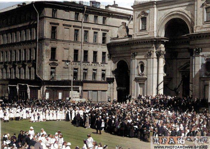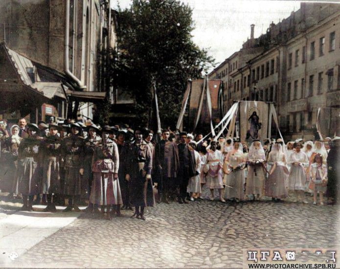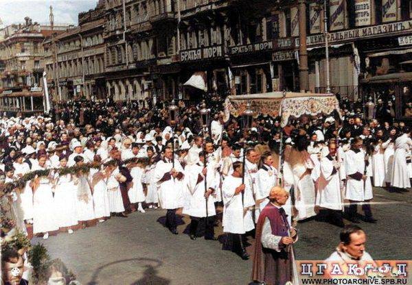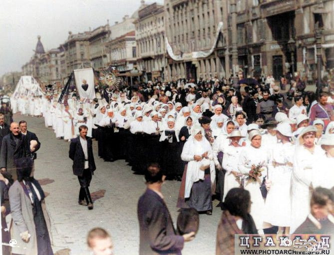 Procesja Bożego Ciała w Piotrogradzie na Newskim Prospekcie w 1917 i 1918 roku w kolorze.