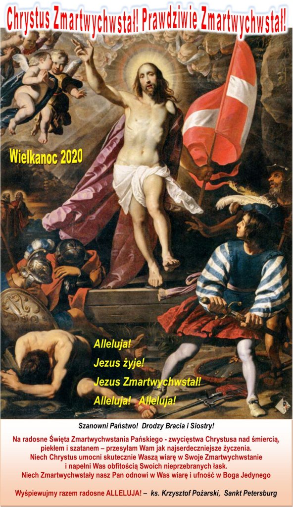 Alleluja! Jezus żyje! Jezus Zmartwychwstał!Alleluja! Alleluja! Szanowni Państwo! Drodzy Bracia i Siostry! Na radosne Święta Zmartwychwstania Pańskiego – zwycięstwa Chrystusa nad śmiercią, piekłem i szatanem – przesyłam Wam jak najserdeczniejsze życzenia. Niech Chrystus umocni skutecznie Waszą wiarę w Swoje Zmartwychwstanie napełni Was obfitością Swoich nieprzebranych łask. Niech Zmartwychwstały nasz Pan odnowi w Was wiarę i ufność w Boga JedynegoWyśpiewujmy razem radosne ALLELUJA! – ks. Krzysztof Pożarski, Sankt Petersburg