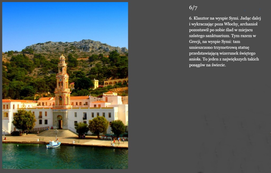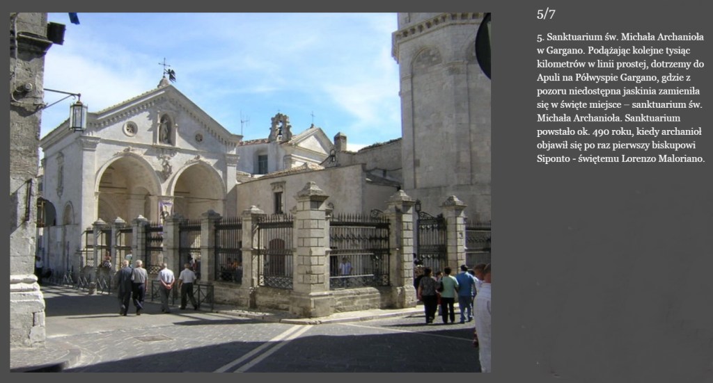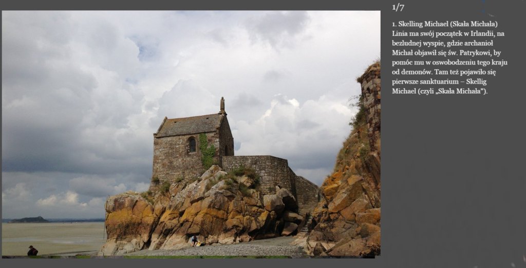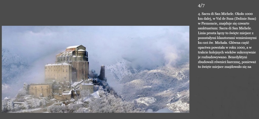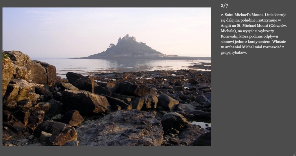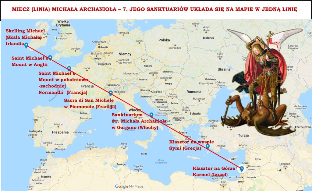 Tajemnicza linia łączy 7 sanktuariów, w których do dzisiaj czynny jest kult Świętego Archanioła. Wszystkie jego sanktuaria łączy prosta linia: od Irlandii do Izraela. Niektórzy tę linię nazywają „mieczem św. Michała Archanioła”, który zwyciężył diabła-szatana i strącił go do piekieł. Ponadto, okazuje się, że w dniu przesilenia letniego owa linia idealnie wyrównuje się z zachodzącym słońcem. Czyż ten znak pozostawiony na Europie nie jest jakimś napomnieniem św. Michała Archanioła (Któż, jak Bóg) , wodza niebieskich legionów, że ustawodawstwo Boskie powinny być zawsze szanowane, a ludzie winni żyć w swojej prawości.1. Skelling Michael (Skała Michała) Linia ma swój początek w Irlandii, na bezludnej wyspie, gdzie archanioł Michał objawił się św. Patrykowi, by pomóc mu w oswobodzeniu tego kraju od demonów. Tam też pojawiło się pierwsze sanktuarium – Skellig Michael (czyli „Skała Michała”).2. Saint Michael’s Mount. Linia kieruje się dalej na południe i zatrzymuje w Anglii na St. Michael Mount (Górze św. Michała), na wyspie u wybrzeży Kornwalii, która podczas odpływu stanowi jedno z kontynentem. Właśnie tu archanioł Michał miał rozmawiać z grupą rybaków.3. Mont Saint Michel. Tajemnicza linia biegnie dalej do Francji, na inną słynną wyspę – Mont Saint Michel. To również jedno z miejsc, w których objawił się archanioł Michał. Piękno samego sanktuarium oraz zatoka przy wybrzeżu Normandii czynią wyspę jednym z najbardziej uczęszczanych przez turystów miejsc w całej Francji. Od 1979 roku sanktuarium wpisane jest także na Listę Światowego Dziedzictwa UNESCO. W 709 roku archanioł objawił się św. bp. Aubertowi, namawiając go, by zbudowałkościół na skale. Prace rozpoczęły się, a św. Aubert wzniósł na skalistym wzgórzu kaplicę. Dało to początek rozwoju kultu św. Michała. Następnie w to miejsce w 966 roku sprowadzono Benedyktynów, którzy mieli rozwijać i umacniać kult św. Michała.4. Sacra di San Michele. Około 1000 km dalej, w Val de Susa (Dolinie Susa) w Piemoncie, znajduje się czwarte sanktuarium: Sacra di San Michele. Linia prosta łączy to święte miejsce z pozostałymi klasztorami wzniesionymi ku czci św. Michała. Główna część opactwa powstała w roku 1000, a w trakcie kolejnych wieków sukcesywnie je rozbudowywano. Benedyktyni zbudowali również karczmę, ponieważ to święte miejsce znajdowało się na szlaku, którym pielgrzymi podążali przez Via Francigena (znaną także jako „Drogę Lombardzką).5. Sanktuarium św. Michała Archanioła w Gargano. Podążając kolejne tysiąc kilometrów w linii prostej, dotrzemy do Apuli na Półwyspie Gargano, gdzie z pozoru niedostępna jaskinia zamieniła się w święte miejsce – sanktuarium św. Michała Archanioła. Sanktuarium powstało ok. 490 roku, kiedy archanioł objawił się po raz pierwszy biskupowi Siponto – świętemu Lorenzo Maloriano.6. Klasztor na wyspie Symi. Jadąc dalej i wykraczając poza Włochy, archanioł pozostawił po sobie ślad w miejscu szóstego sanktuarium. Tym razem w Grecji, na wyspie Symi: tam umieszczono trzymetrową statuę przedstawiającą wizerunek świętego anioła. To jeden z największych takich posągów na świecie.7. Klasztor na Górze Karmel. Święta linia ma swój koniec w dzisiejszym Izraelu, w klasztorze na Górze Karmel w Hajfie. To miejsce otoczone jest kultem już od starożytności, jednak jako sanktuarium chrześcijańskie i katolickie zaczęło funkcjonować w XII wieku. Również na terenie Anglii od Carn Les Boal w Kornwalii do Burry St Edmunds w hrabstwie Suffolk znajduje się tajemnicza linia, wzdłuż której od czasów neolitu zbudowano wiele obiektów kultu religijnego, w tym szczególnie w późniejszym czasie dużo kościołów pod wezwaniem św. Michała. Ponadto trzy z tych sanktuariów, SACRA DI SAN MICHELE (Irlandia), MONT SAINT MICHEl (Francja) iSanktuarium św. Michała Archanioła w MONTE SANT’ANGELO (Włochy) są oddalone od siebie w dokładnie tej samej odległości. Św. Michale Archaniele, módl się za nami i za mieszkańców Europy i wspomagaj nas w walce przeciwko piekielnym zasadzkom!