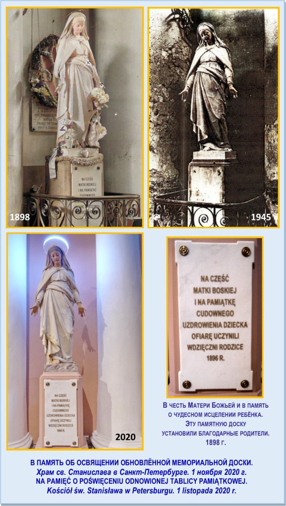 W uroczystość Wszystkich Świętych, w dniu 1 listopada 2020 roku była także poświęcona przez biskupa pomocniczego Archidiecezji Matki Bożej w Moskwie bp. Mikołaja Dubinina, nowa tablica wdzięczności Matce Bożej na miejscu starej i zniszczonej w czasach sowieckich. W 1898 roku jedna rodzina z parafii doznała wyjątkowej łaski uzdrowienia swojego dziecka przez wstawiennictwo Maryi. W związku z tym postanowili ufundować marmurową tablicę wdzięczności przed kamienną figurą Matki Bożej Łaskawej (która się znajdowała w kościele od momentu jego poświęcenia w 1825 roku) o następującej treści „W CZEŚĆ MATKI BOŻEJ I NA PAMIĄTKĘ CUDOWNEGO UZDROWIENIA DZIECKA. OFIARĘ UCZYNILI WDZIĘCZNI RODZICE. 1898 R.” (В честь Матери Божьей и в память о чудесном исцелении ребёнка. Эту памятную доску пожертвовали благодарные родители. 1898 г.) Tablica ta w latach 40. XX wieku została zniszczona. Kamienna zaś figura Matki Bożej (waży ok. 500 kg) ocalała, gdyż po wspomnieniach jednej parafianki, gdy chciano ją rozbić i robotnik uderzył pierwszy raz, popłynęła krew i obecni przy dewastacji się wystraszyli i w ten sposób była uratowana. W 1947 roku statua Matki Bożej została przewieziona do kościoła Matki Bożej z Lourdes na Kowieński piereułok przez jej proboszcza, gdzie znajdowała się 50 lat, do 1997 roku. W tymże roku po inicjatywie proboszcza parafii św. Stanisława, ks. Krzysztofa Pożarskiego, statua wróciła na swoje miejsce na swój postument w kościele św. Stanisława. MATKO BOŻA ŁASKAWA, MÓDL SIĘ ZA NAMI I WSPOMAGAJ NAS!