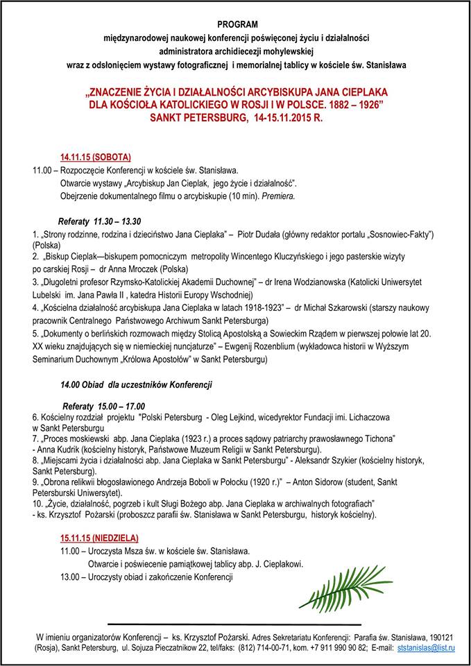W programie było także odsłonięcie wystawy fotograficznej i tablicy pamiątkowej w kościele św. Stanisława, a także autokarowa pielgrzymka do miejsc jego życia działalności w Petersburgu. Konferencja odbywała w kościele św. Stanisława.