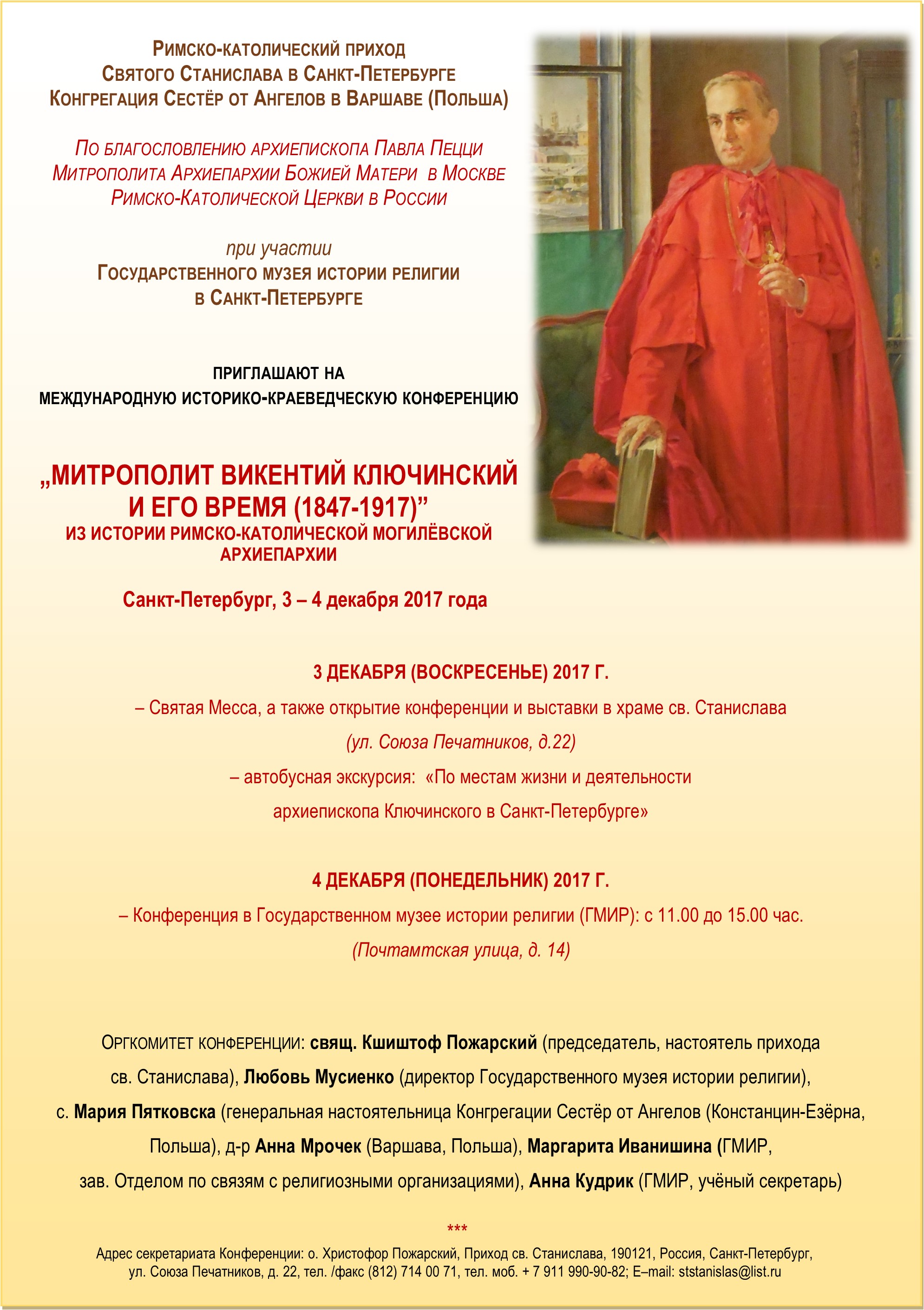 W dniach 3 i 4 grudnia 2017 roku w kościele św. Stanisława i w Państwowym Muzeum Religii w Petersburgu odbyła się międzynarodowa Konferencja poświęcona trzynastemu arcybiskupowi metropolicie mohylewskiemu Wincentemu Kluczyńskiemu (1847-1917). W 2017 roku przypadało 100. lecie jego śmierci.