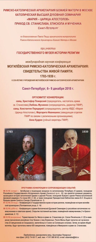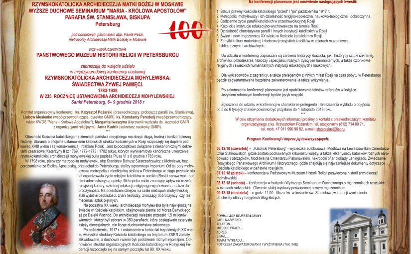 W dniach od 6 do 9 grudnia 2018 roku w Petersburgu odbywała się międzynarodowa konferencja „Rzymskokatolicka archidiecezja mohylewska: Świadectwa żywej pamięci. 1783-1939. W 235. Rocznicę ustanowienia archidiecezji mohylewskiej”. Odbyła się ona pod honorowym patronatem abp. Pawła Pezzi, metropolity Archidiecezji Matki Boskiej w Moskwie przy współuczestnictwie Państwowego Muzeum Historii Religii w Petersburgu. Jej głównymi organizatorami była parafia św. Stanisława, biskupa, a także Wyższe Duchowe Seminarium „Maria – Królowa Apostołów”.