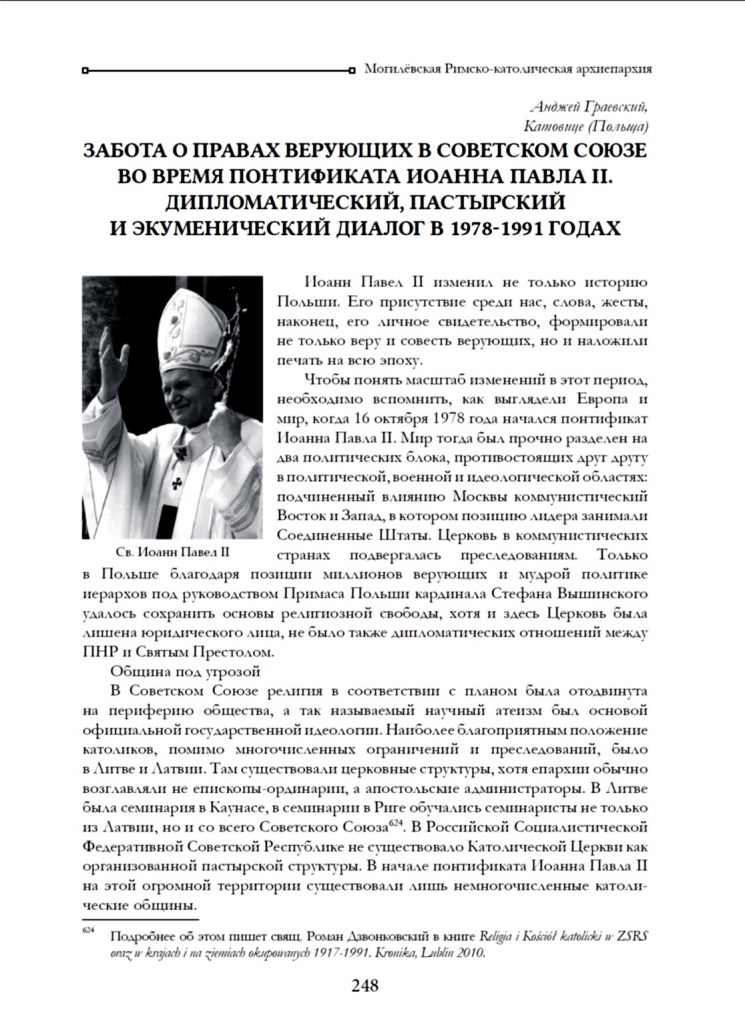 К сожалению, учение Папы и его дела в настоящее время все чаще забываются, но они актуальны и сегодня. В этой связи я хотел бы представить доклад Анджея Граевского, журналиста из Польши: «Забота о правах верующих в Советском Союзе во время понтификата Иоанна Павла II. Дипломатический, пастырский и экуменический диалог в 1978-1991 годах», представленный на международной конференции «Могилёвская Римско-католическая архиепархия: свидетельства живой памяти. 1783-1939», состоявшейся в Санкт-Петербурге 8 декабря 2018 года.