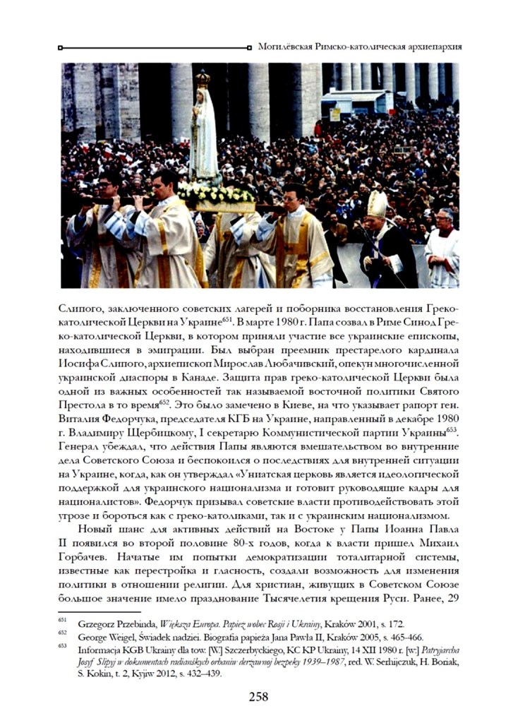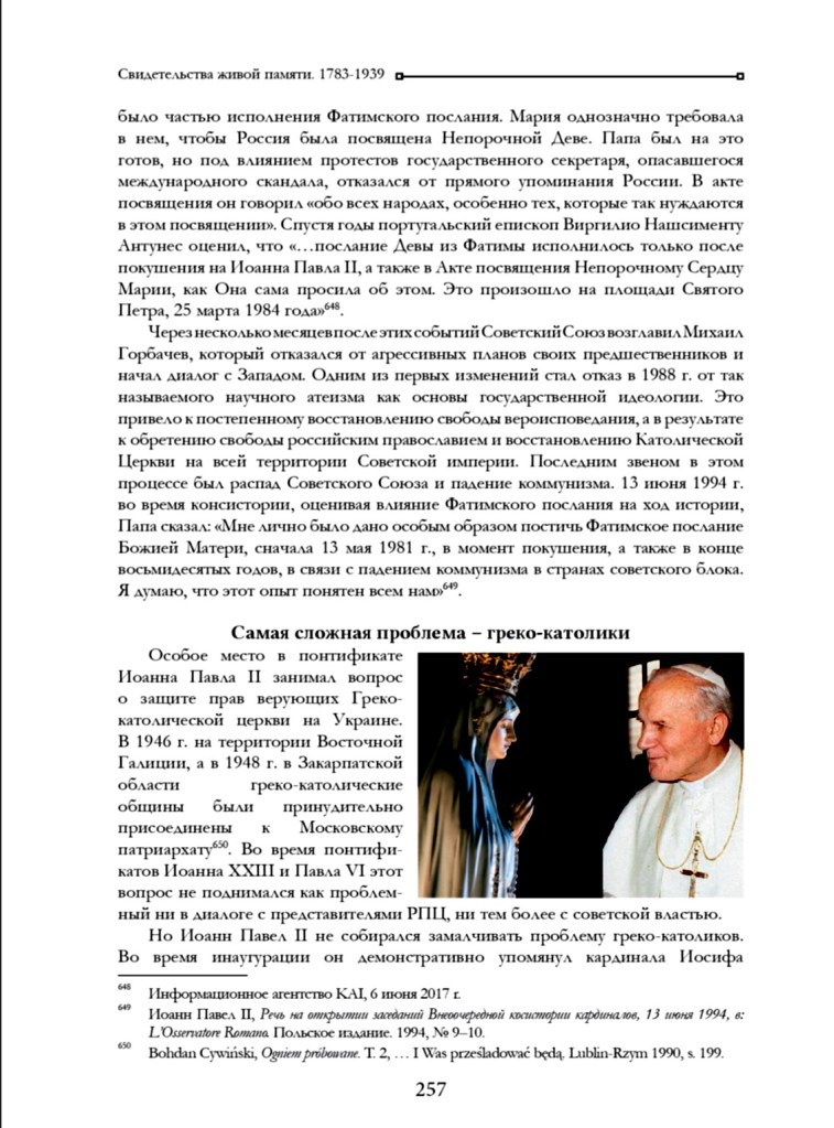 Особое место в понтификате Иоанна Павла II занимал вопрос о защите прав верующих Греко-католической церкви на Украине. В 1946 г. на территории Восточной Галиции, a в 1948 г. в Закарпатской области греко-католические общины были принудительно присоединены к Московскому патриархату[27]. Во время понтификатов Иоанна XXIII и Павла VI этот вопрос не поднимался как проблемный ни в диалоге с представителями РПЦ, ни тем более с советской властью.