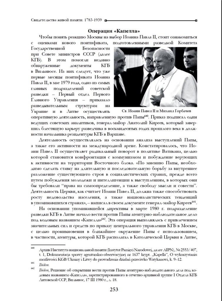На основании упоминавшейся директивы в марте 1980 г. подразделение разведки КГБ в Литве начало вести против Папы агентурно-наблюдательное дело под кодовым названием «Капелла».[19] Эта операция выполнялась с привлечением значительных сил и средств по приказу центрального управления КГБ в Москве, с целью проникновения в ближайшее окружение Папы с использованием, в частности, агентуры, которой КГБ располагал в Католической Церкви в Литве, а также в кругах литовской эмиграции в Соединенных Штатах. Подобные действия КГБ осуществлял на Украине, а их целью прежде всего было проникновение в среду грекокатоликов на Западе, а также отслеживание работы Конгрегации по делам Восточных Церквей, отвечающей за их функционирование в Католической Церкви. Согласно оценке советских аналитиков, выбор кардинала Войтылы означал радикальные изменения в восточной политике Святого Престола, что представляло непосредственную угрозу для безопасности Советского Союза.